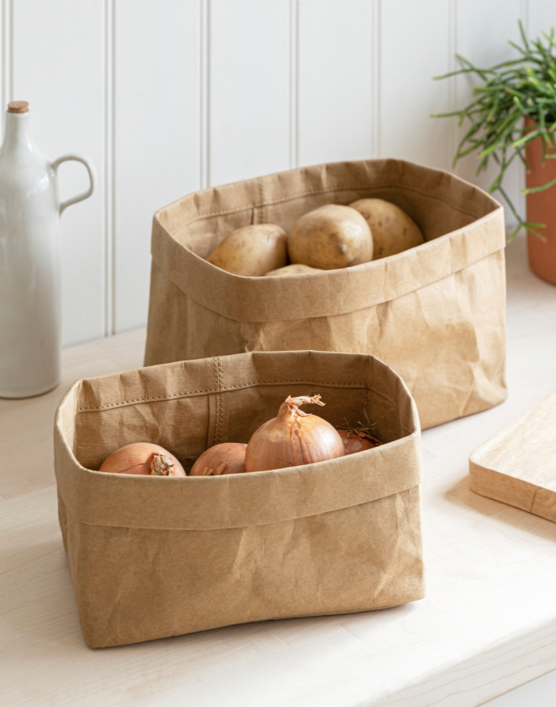 These stylish kraft paper bags are designed for kitchen storage, to keep everything from towels, rags and cleaning products organised, or ingredients and veg safely stowed. Organise your kitchen your way.